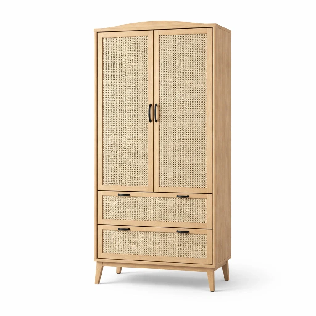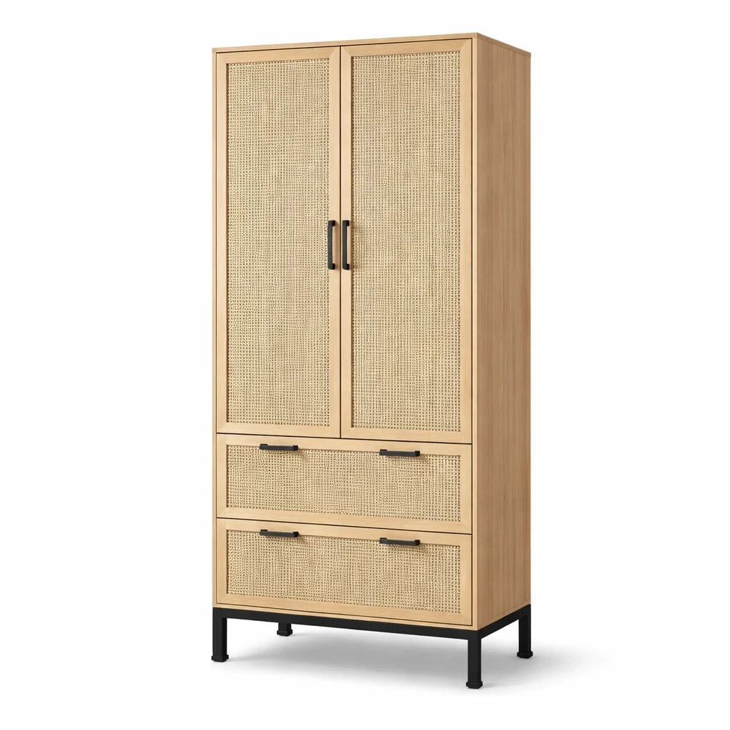 Armoire en bois avec portes en rotin et deux tiroirs beige