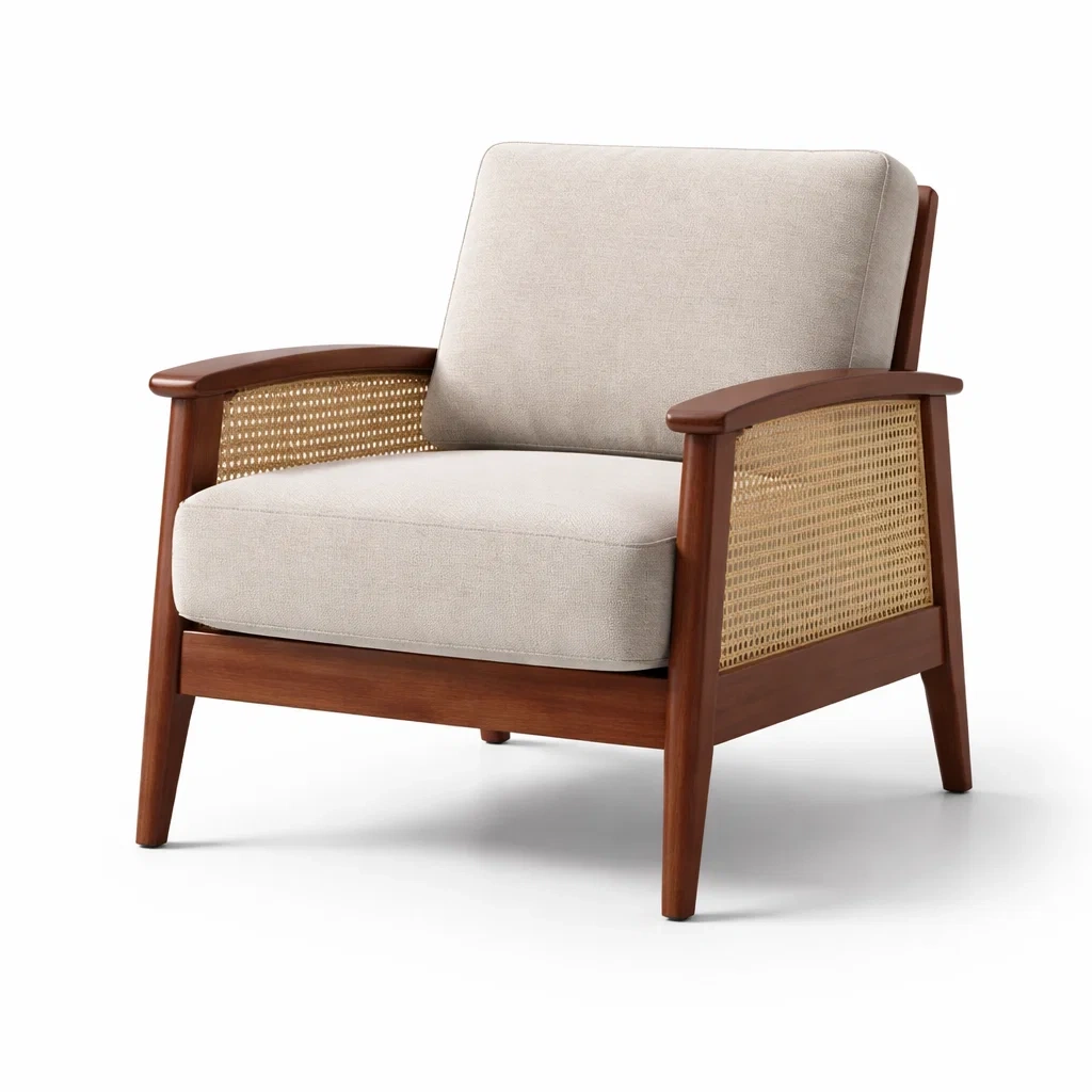 Fauteuil en bois avec accoudoirs en rotin et coussin en tissu beige