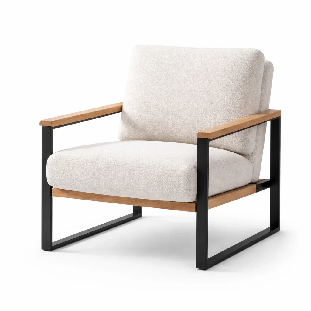 Fauteuil en tissu bouclé avec cadre en métal et accoudoirs en bois