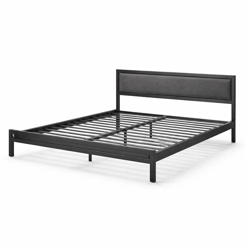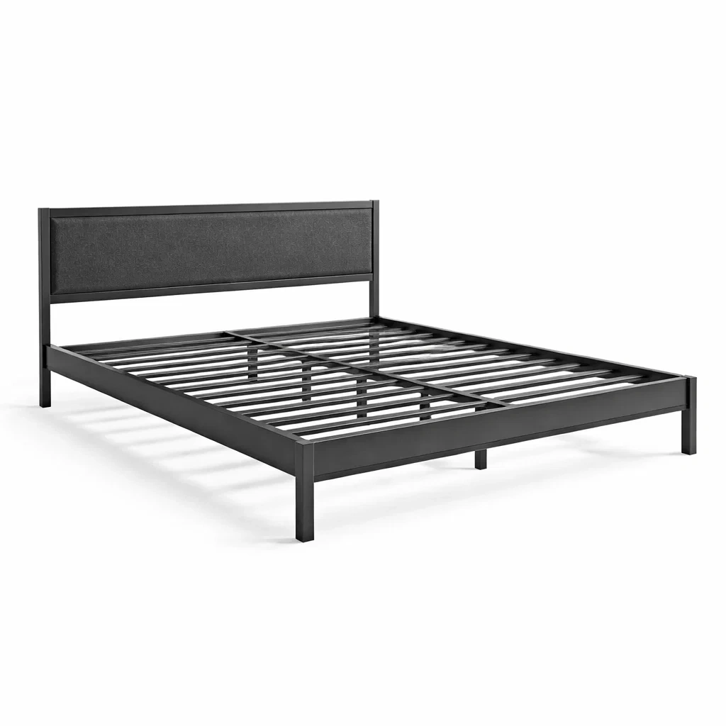 Lit en métal noir et polyester beige avec tête de lit rembourrée