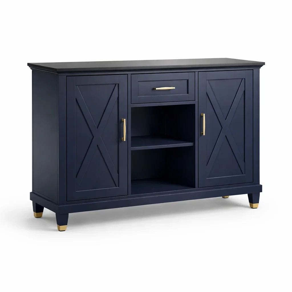 Espace de rangement : 1 tiroir, 2 étagères ouvertes, 2 portes fermées.