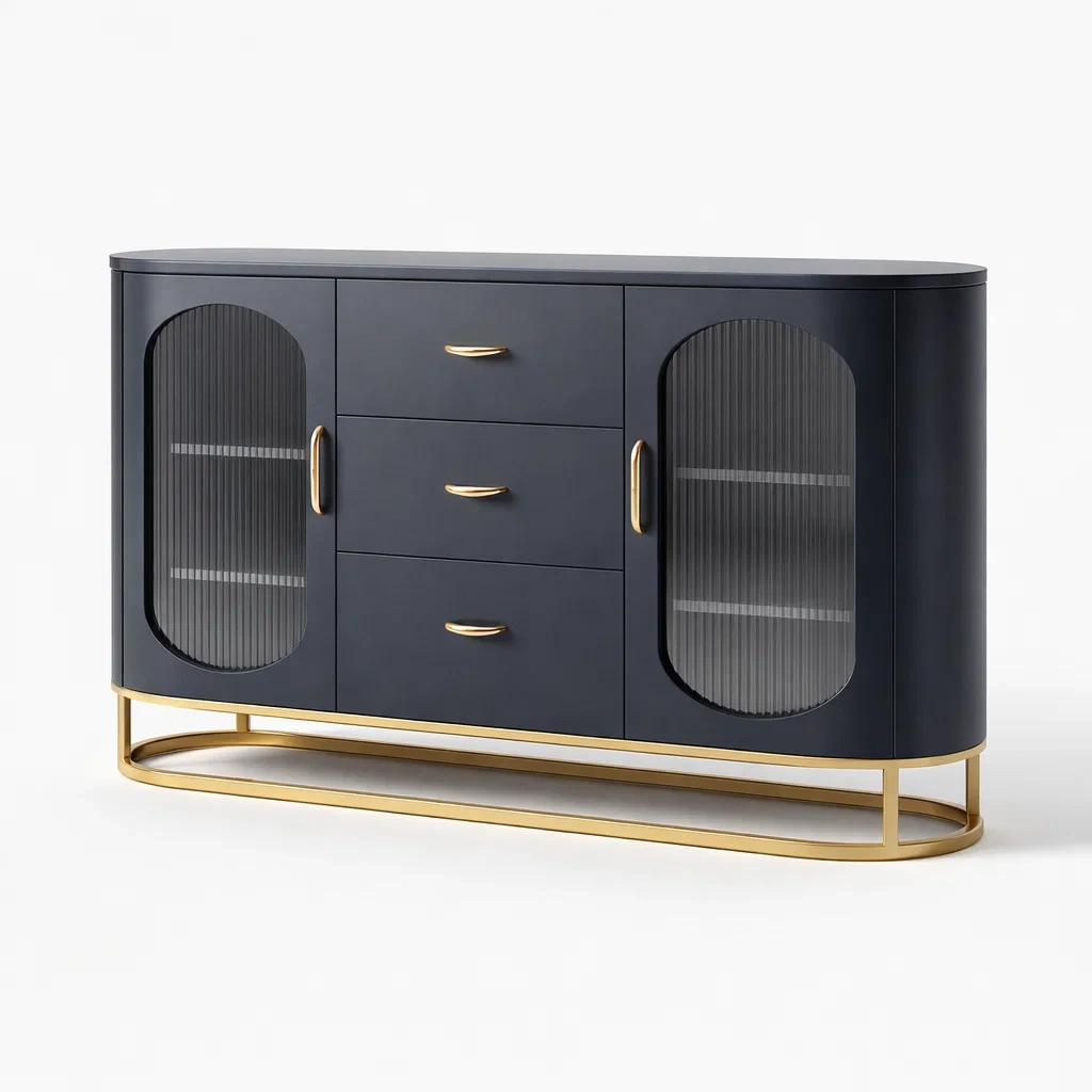 Le buffet est fabriqué en bois MDF avec des portes en verre trempé cannelé de 5 mm d'épaisseur. La base est en métal avec une finition dorée. Il comprend deux portes vitrées et trois tiroirs centraux.