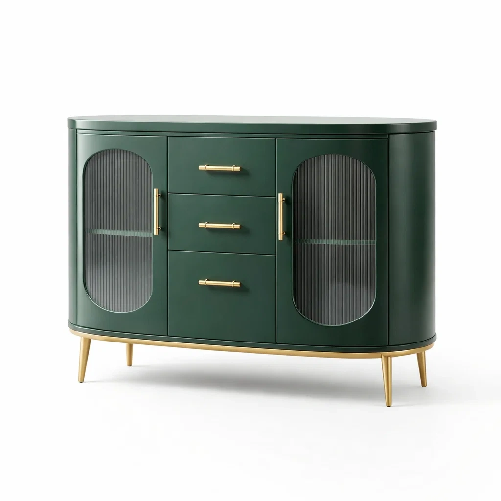 Bois MDF, verre rainuré, métal pour les pieds et poignées
