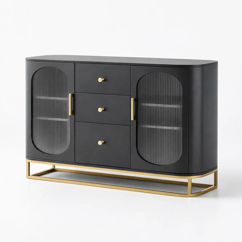 Matériau : Structure en bois MDF, portes en verre trempé cannelé de 5 mm, base en métal doré