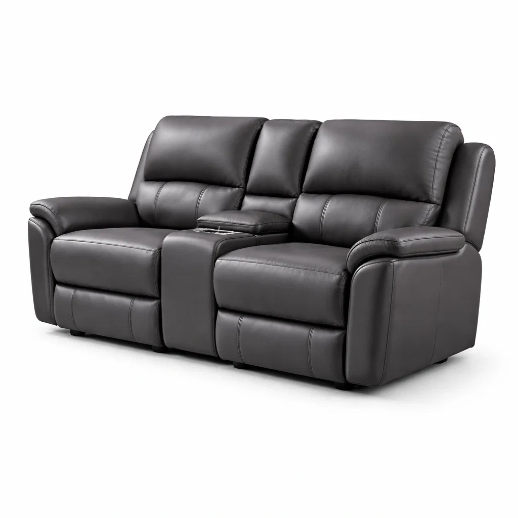 Ce canapé inclinable pour deux personnes est fabriqué en cuir synthétique résistant. La structure est en bois massif, offrant une stabilité assurée. Les coussins sont remplis de mousse haute densité. Le canapé est équipé de porte-gobelets intégrés. Dimensions : longueur 195 cm, largeur 95 cm, hauteur 105 cm.