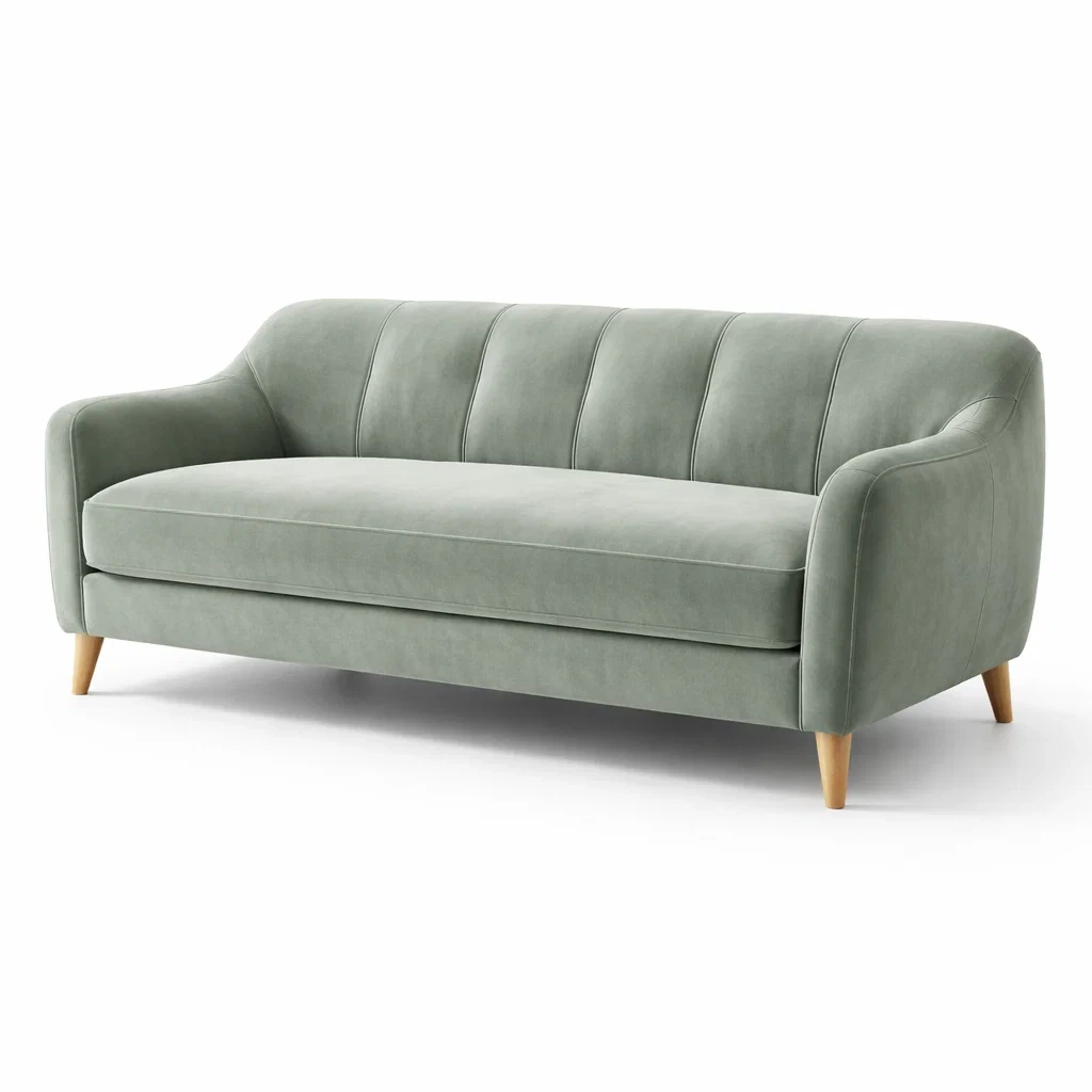 Canapé trois places recouvert de velours avec une structure en bois massif.