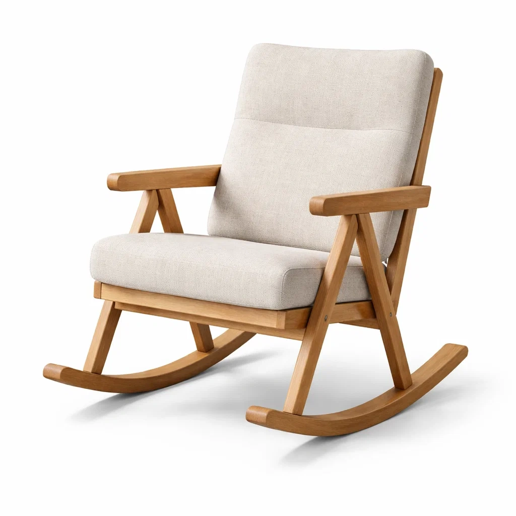 Le fauteuil à bascule dispose d'une structure en bois massif pour une solidité et durabilité optimales. Le rembourrage est en mousse et est recouvert d'un tissu en polyester beige.