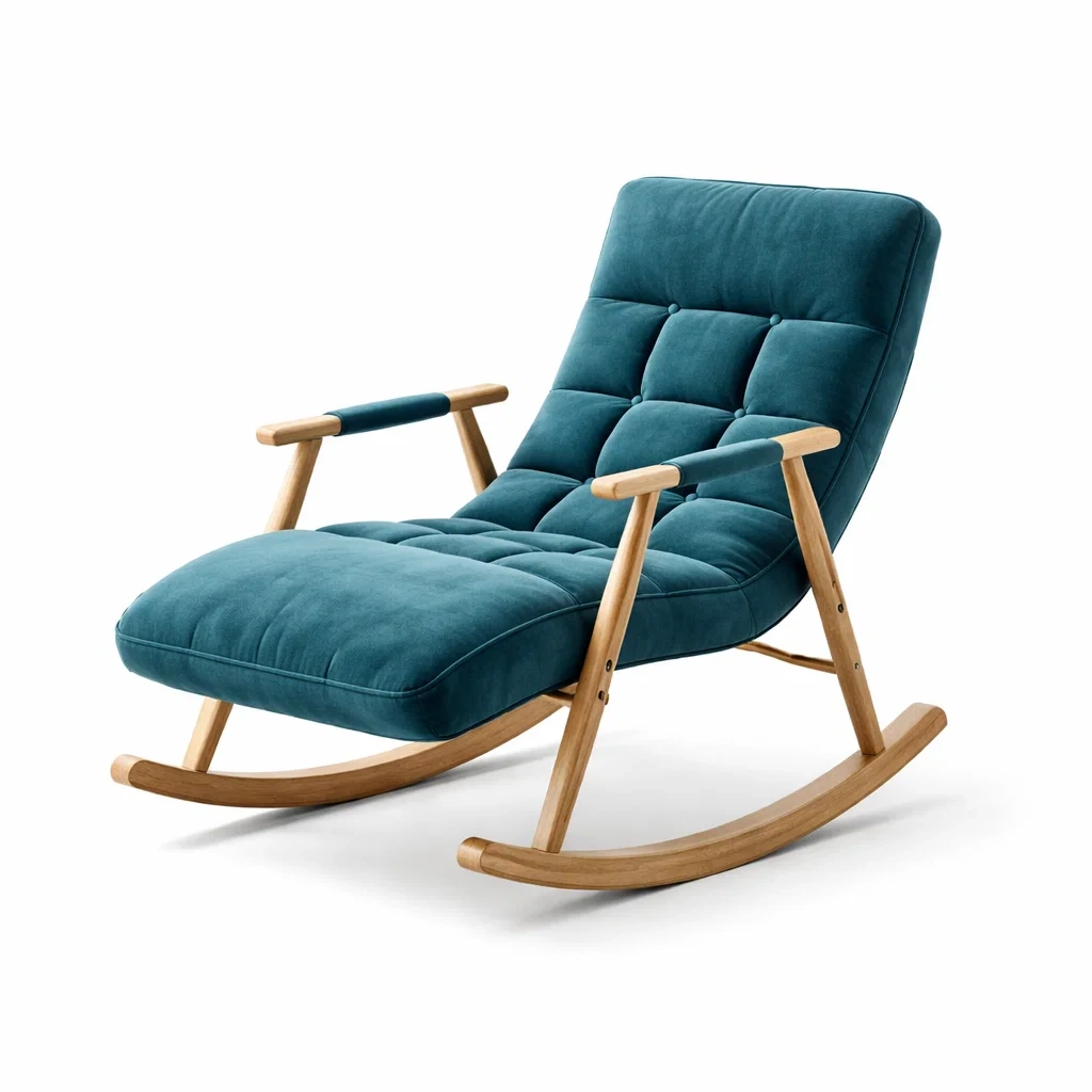 Ce fauteuil à bascule est fabriqué avec un cadre en bois de chêne massif et un revêtement en velours de polyester. Le rembourrage est en mousse de polyuréthane.