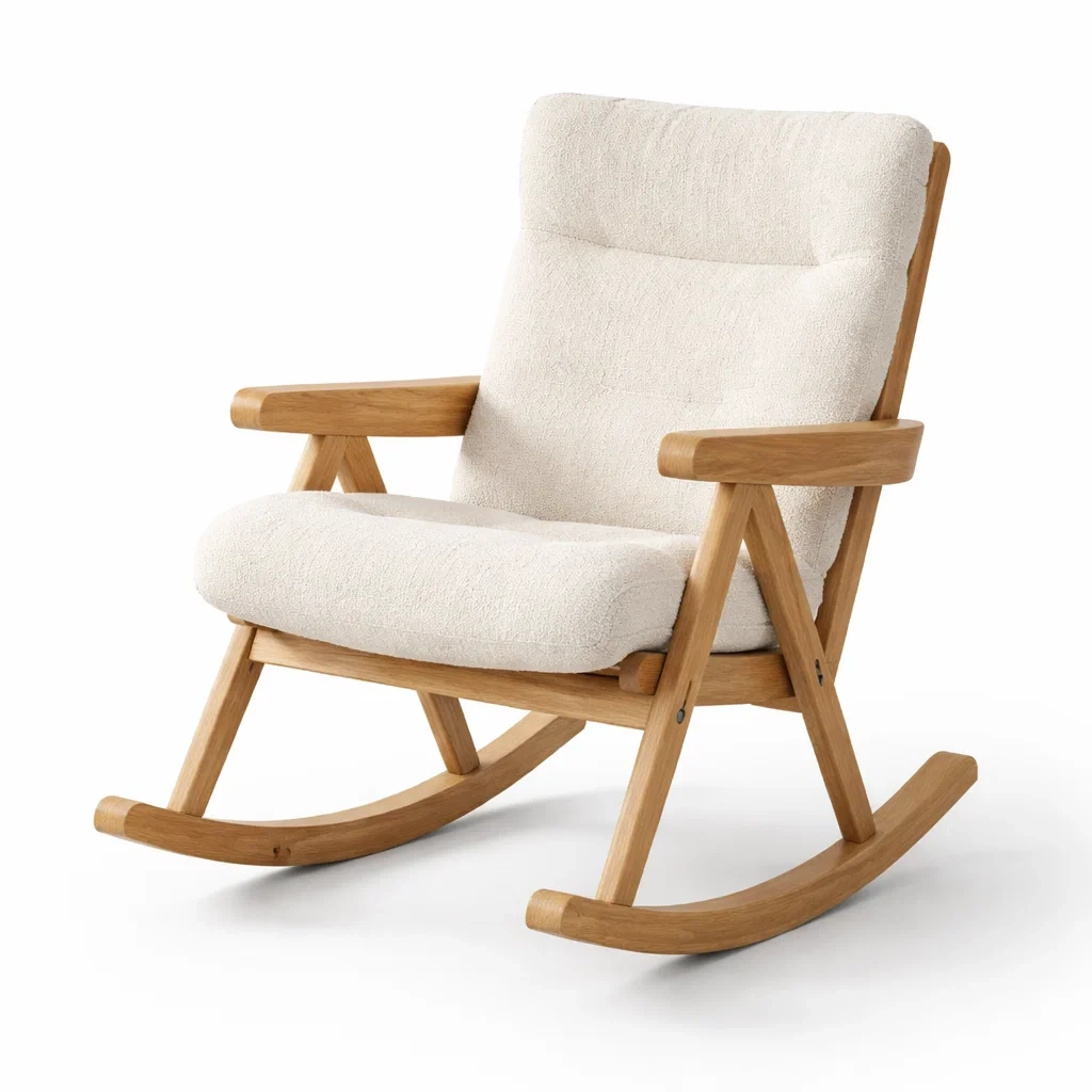 La chaise berçante est dotée d'une structure en chêne et d'un revêtement en tissu bouclé en polyester. Elle supporte une charge maximale de 120 kg.