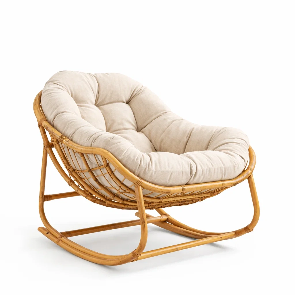 Fauteuil à bascule en rotin avec structure en rotin naturel et coussin en lin beige.
