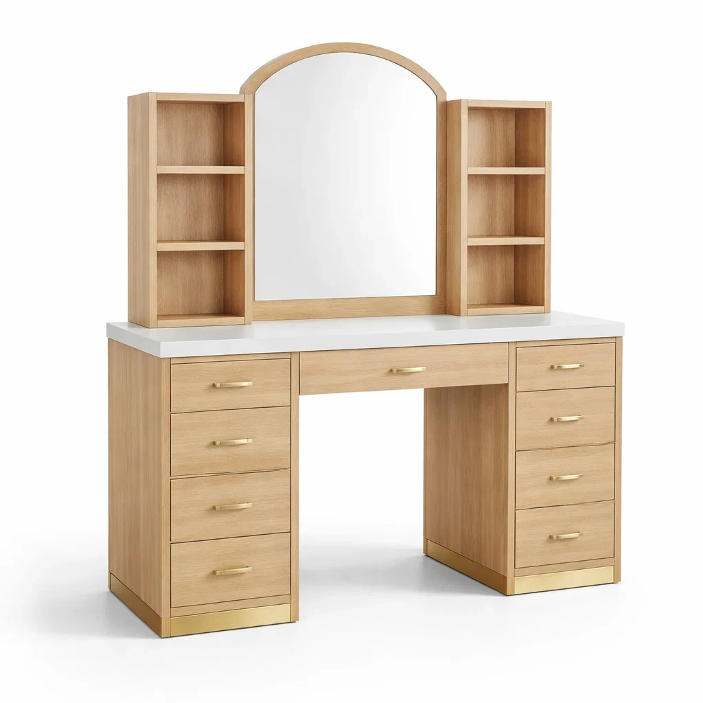 Contenu : 1 coiffeuse avec miroir, 2 étagères, 7 tiroirs