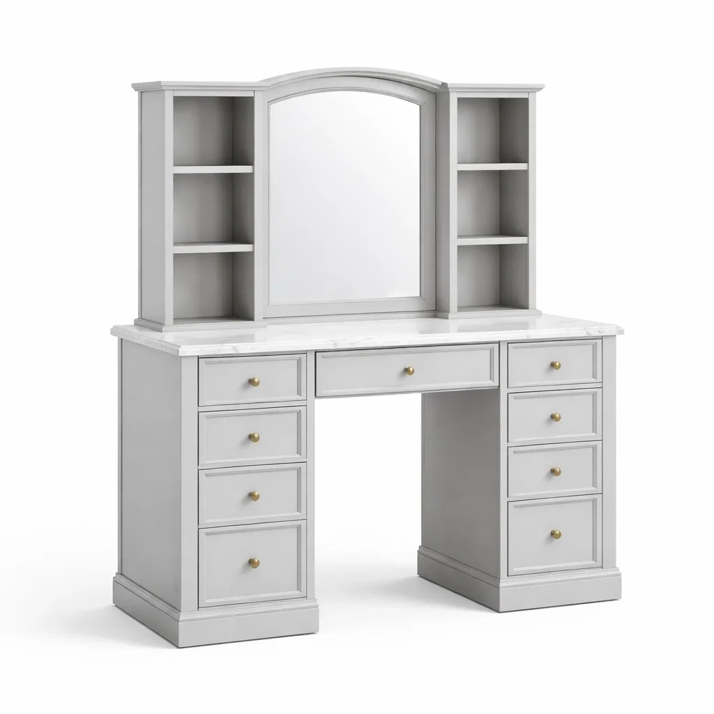 Cette coiffeuse est fabriquée en panneaux de fibres à densité moyenne avec un plateau en faux marbre. Elle est finie avec un vernis satiné en gris clair.