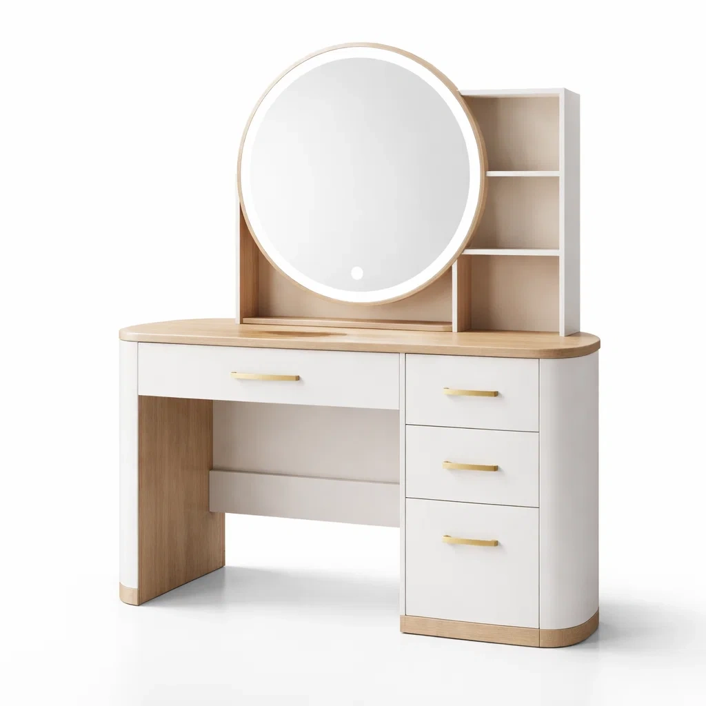 Caractéristiques : Tiroirs de rangement et étagères, miroir rond avec éclairage LED intégré