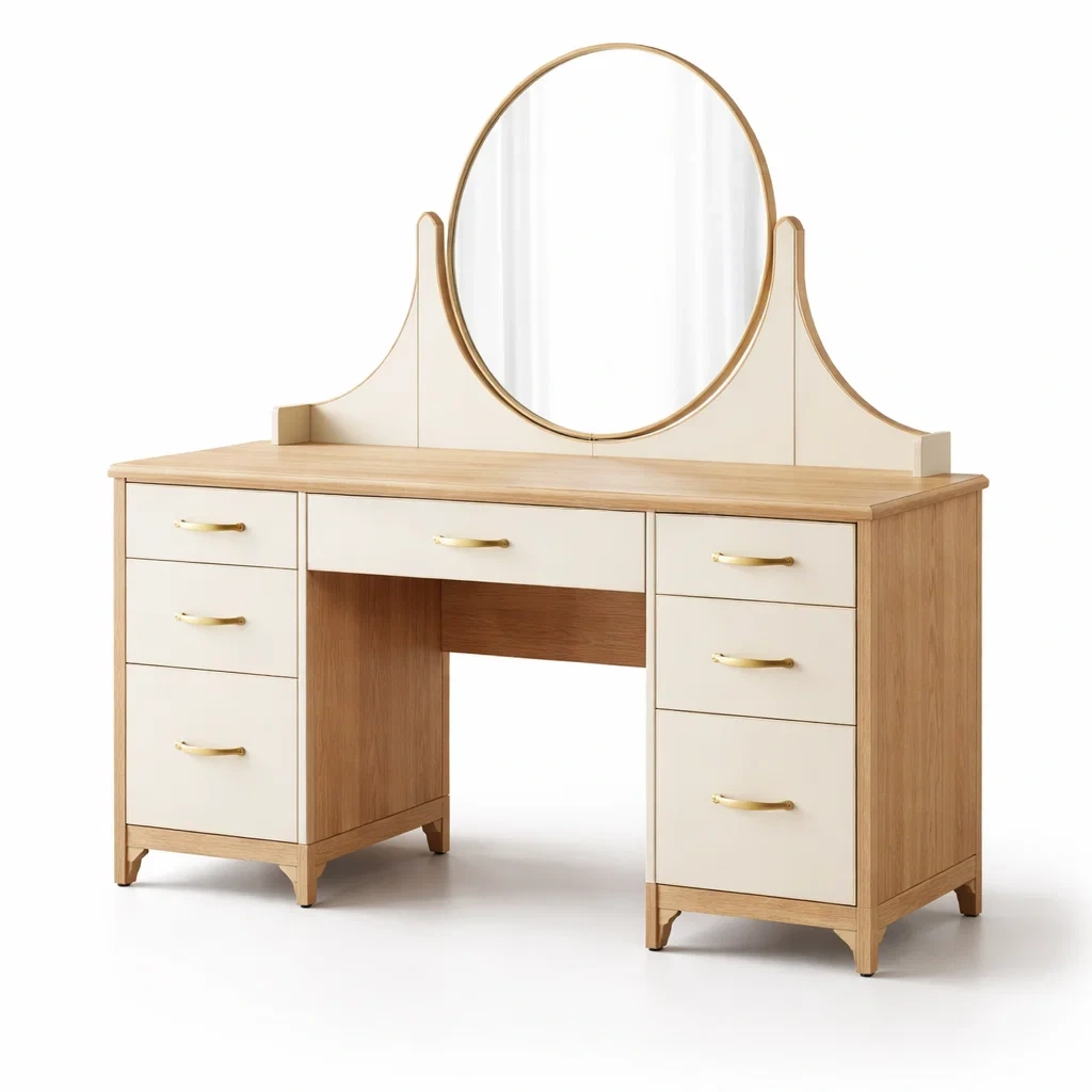 Composants : 1 miroir rond, 7 tiroirs, poignées en métal doré