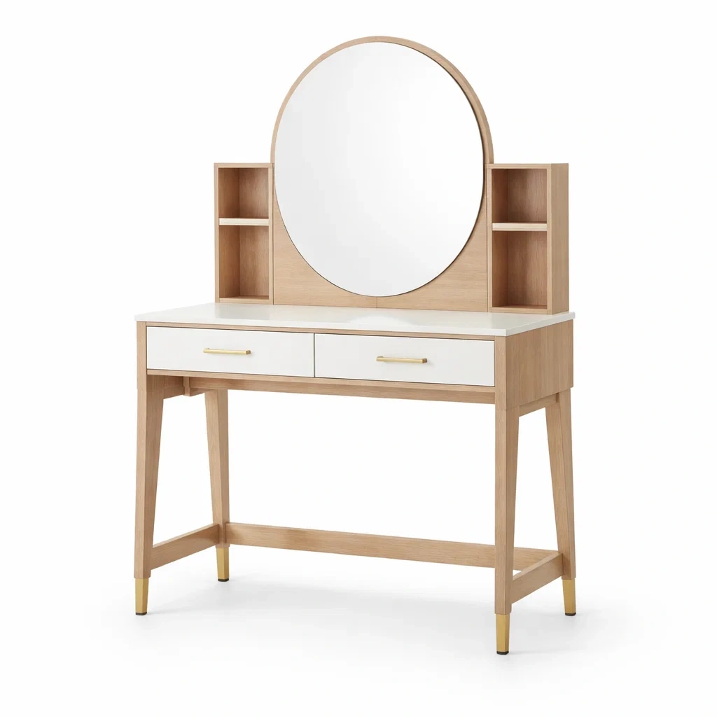Cette coiffeuse est fabriquée en panneaux MDF avec une finition plaquée chêne clair. Elle dispose d'un miroir rond intégré, ainsi que de deux tiroirs pour le rangement. Les étagères ouvertes offrent un espace de rangement supplémentaire pour vos accessoires. Les poignées sont en métal.