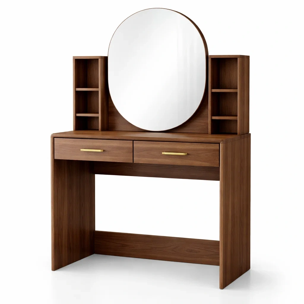 La coiffeuse est fabriquée en bois de noyer et comprend un miroir rond en verre trempé de haute qualité. Elle est équipée de poignées en métal.