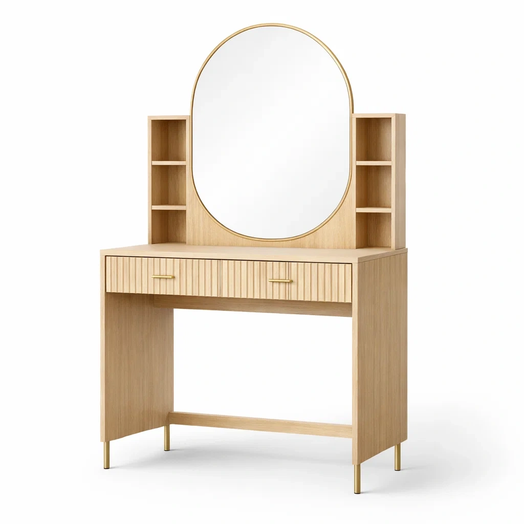 Cette coiffeuse est fabriquée en panneaux de fibres à densité moyenne (MDF) avec un miroir ovale. Elle comporte des étagères de rangement de chaque côté pour une organisation pratique. Les poignées et pieds sont en métal avec des détails dorés.