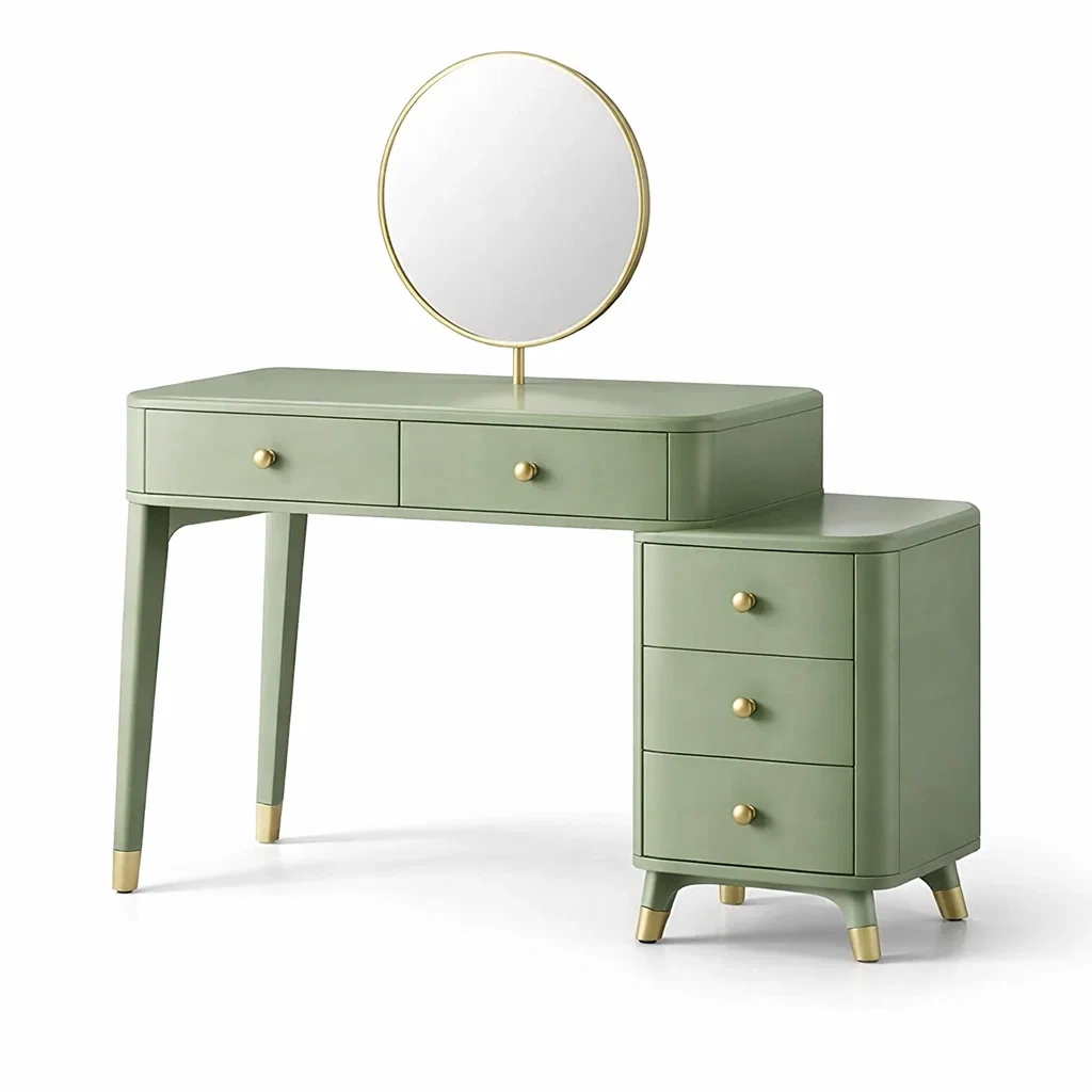 La coiffeuse est fabriquée en bois MDF avec une finition lisse et des pieds en métal doré pour la stabilité. Elle comprend un miroir rond encadré de métal doré.