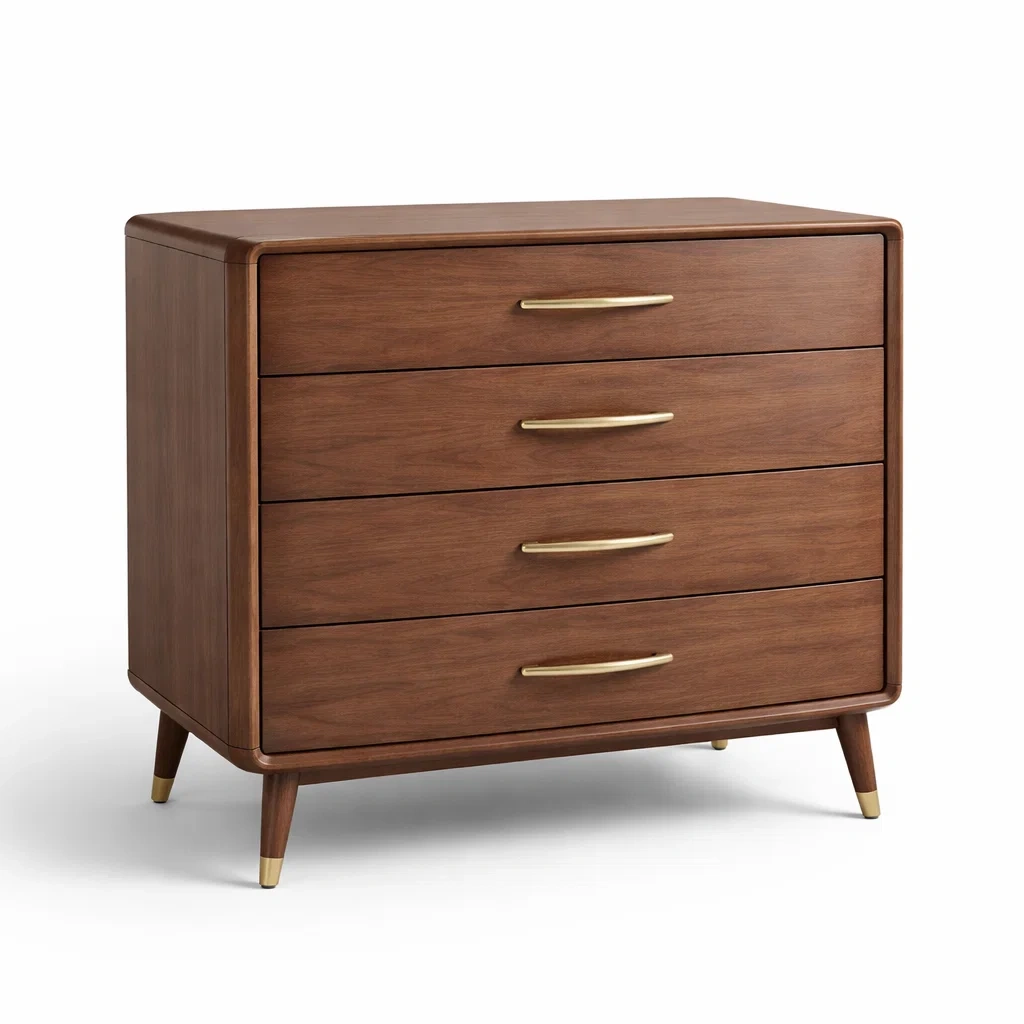 Meuble à tiroirs en bois marron avec 4 tiroirs et poignées dorées