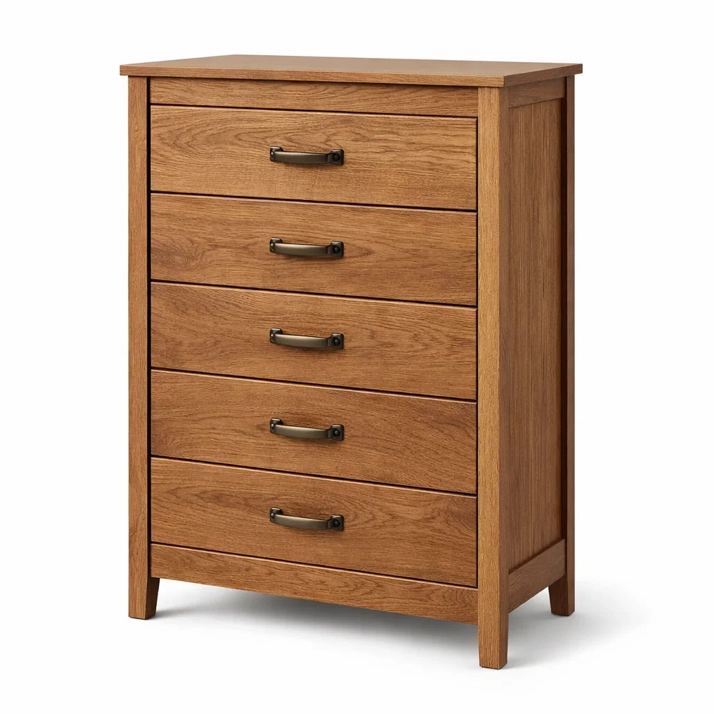 Cette commode est fabriquée en bois de chêne clair avec une structure robuste. Elle comprend cinq tiroirs spacieux, chacun équipé de poignées en métal sombre.
