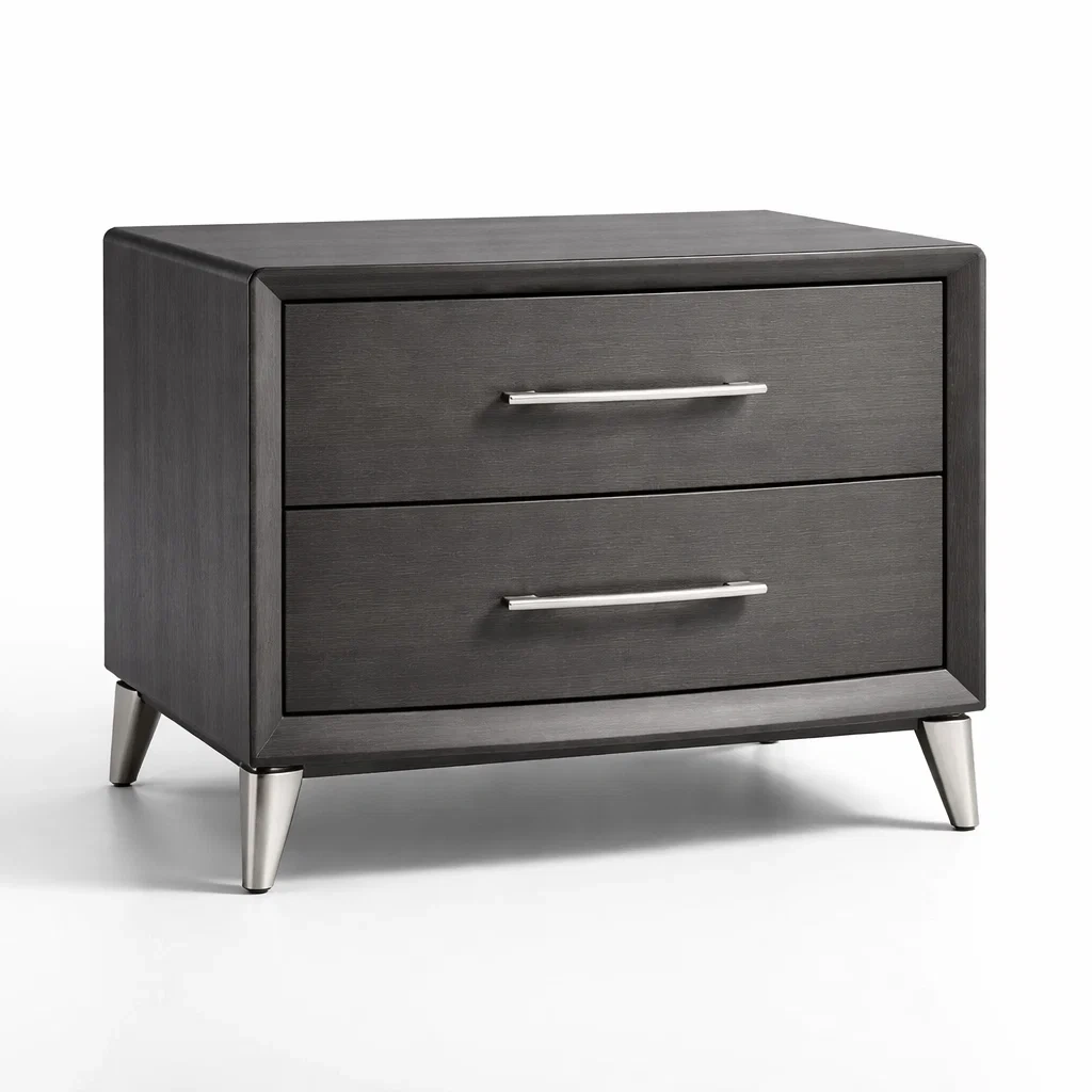 Table de chevet en bois noir avec tiroirs et poignées en métal